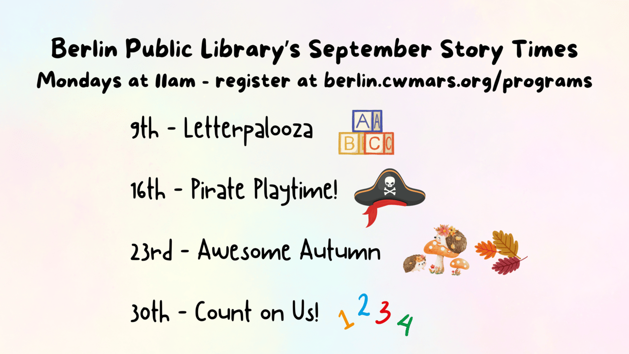 The Berlin Public Library will be closed on Saturday 8/31 and Monday 9/2 in observance of Labor Day. Please keep this in mind if you would like to check out any books for the weekend!