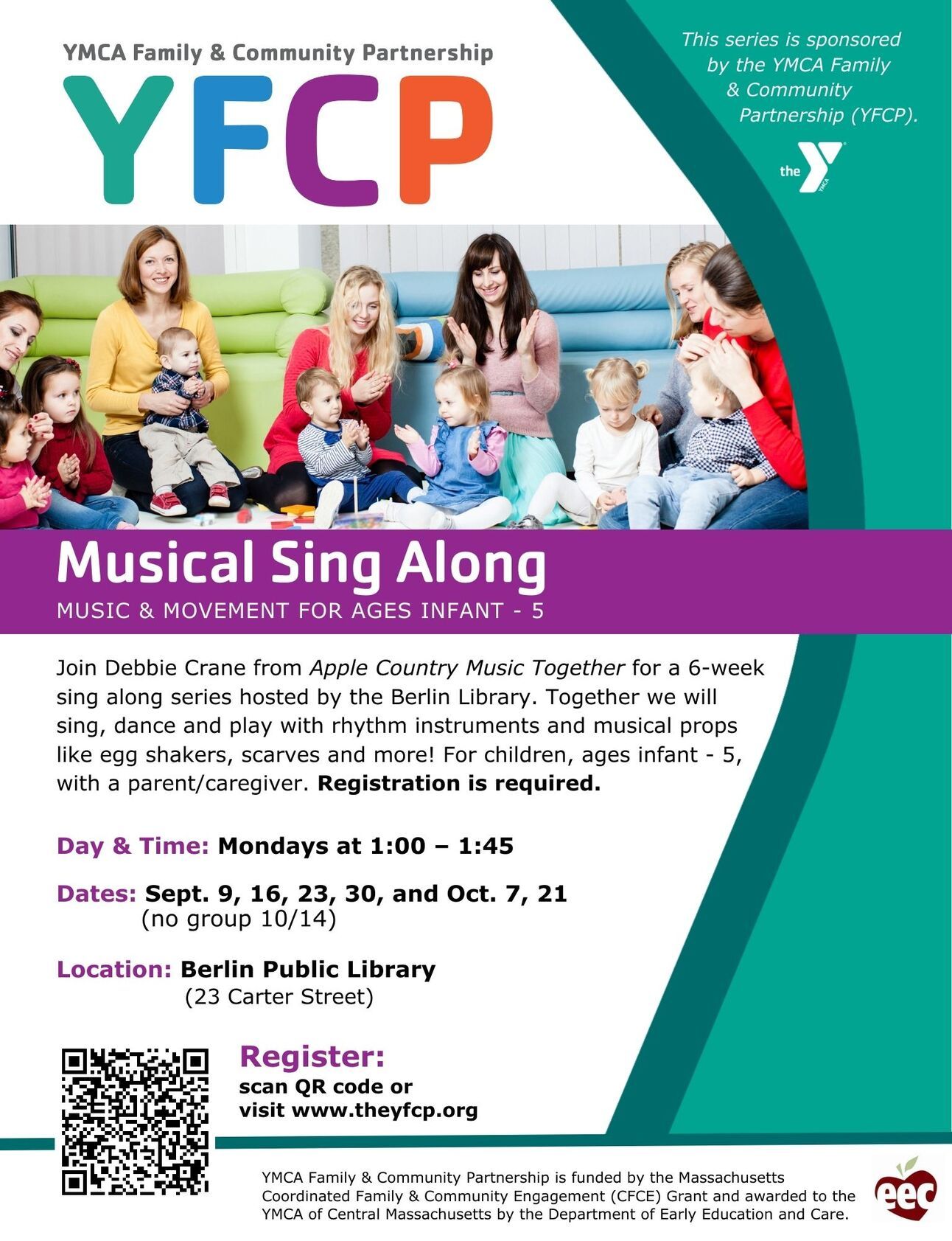 We are excited to be hosting Debbie Crane of Apple Country Music Together for another 6 week sing a long series for ages infant-5. This class will meet at the library on Mondays from 1pm-1:45pm, and participants are asked to attend every class in the series. Registration for this program opens on 8/28 and closes at 8am on 9/4. Register by clicking this link or the image below.