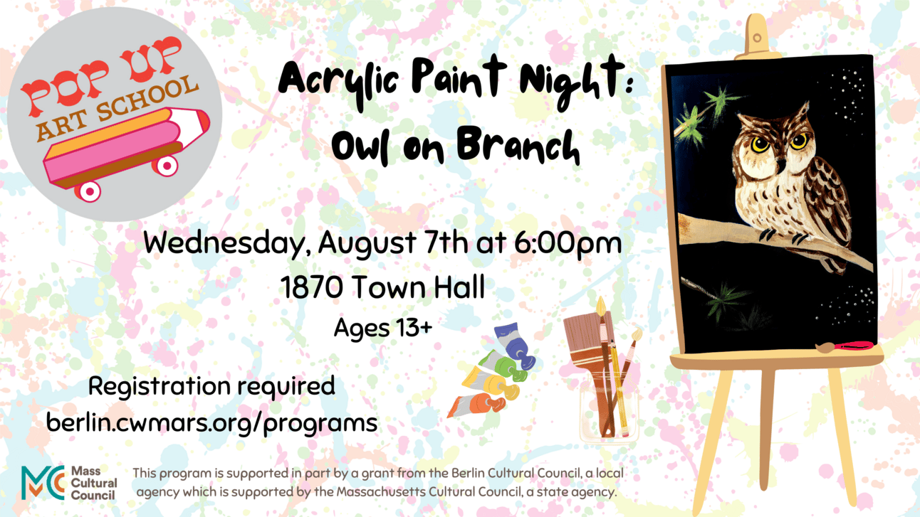 Whoooo's that sitting on a branch? Paint along with Pop up Art School to create this naturalistic owl. Learn how to create wings and feathers that look textural. Finish the painting off with a sprinkling of stars in the night sky. This program is for ages 13+ and registration is required. Space is limited!