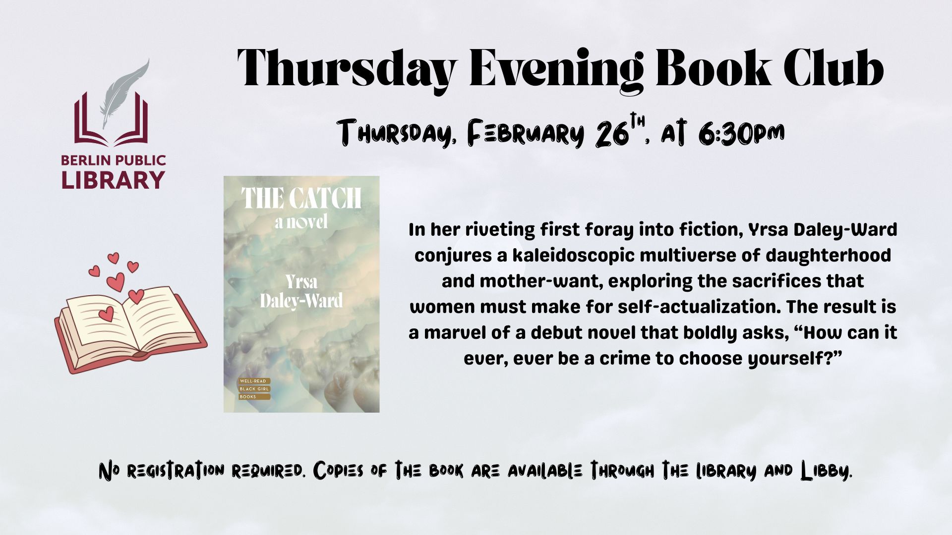 Thursday 2/26 @ 6:30pm: Thursday Evening Book Club: Join us to discuss The Catch by Yrsa Daley-Ward. Copies of the book are available at the library one month before the meeting.