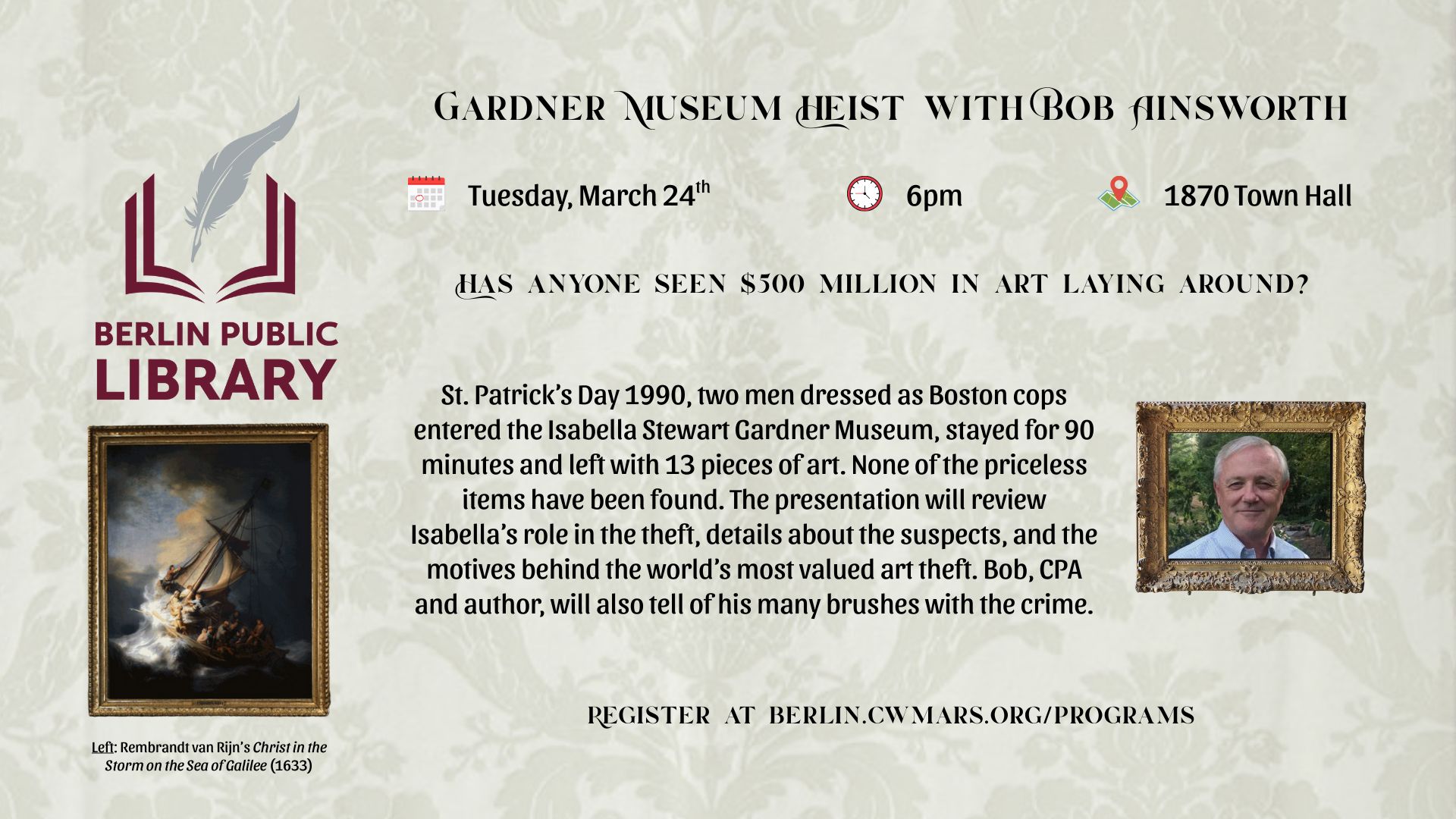Tuesday 3/24 @ 6pm: Gardner Museum Heist: HAS ANYONE SEEN $500 MILLION IN ART LYING AROUND? An hour after 1990 St. Patrick’s Day, two men dressed as Boston cops entered the Isabella Stewart Gardner Museum, stayed for 90 minutes and left with 13 pieces of art. None of the priceless items have been found although one was seen. No one has been charged. The museum continues to post a $10 million reward. This presentation will review Isabella’s role in the theft, details about the suspects, and the motives behind the world’s most valued art theft. Bob Ainsworth, CPA and author, will also tell of his many brushes with the infamous crime.